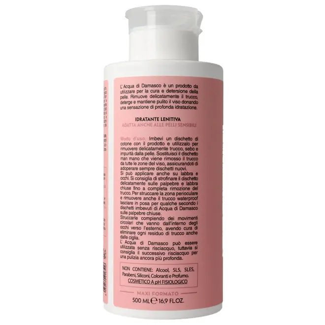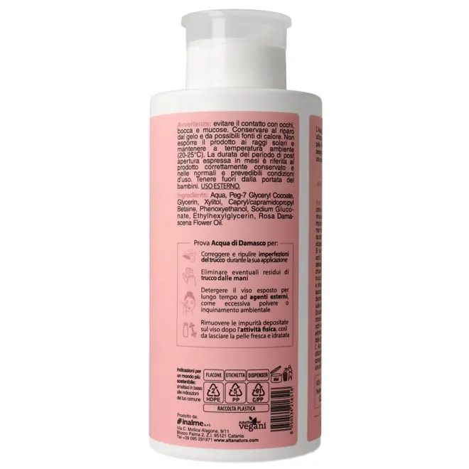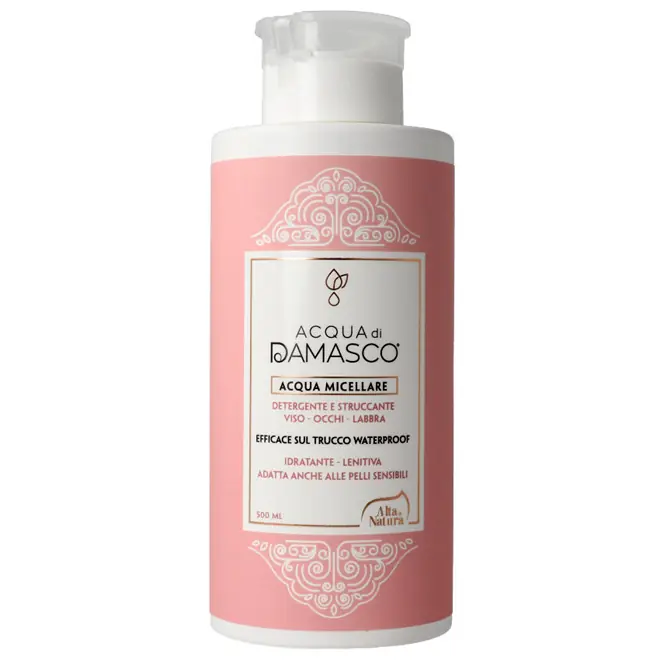 DESCRIZIONEL'Acqua di Damasco Alta Natura è un'acqua micellare, detergente e struccante per viso, occhi e labbra, con acqua di Rosa damascena. Rimuove delicatamente il trucco, deterge e mantiene pulito il viso donando una sensazione di profonda idratazione e freschezza. Efficace sul trucco waterproof. Adatta anche alle pelli sensibili. Con essenza di Rosa Damascena, Glicerina e Xilitolo, per una sensazione di freschezza unica. Può essere utilizzata per correggere e ripulire imperfezioni del trucco durante la sua applicazione, eliminare eventuali residui di trucco dalle mani, detergere il viso esposto per lungo tempo ad agenti esterni, come eccessiva polvere o inquinamento ambientale, rimuovere le impurità depositate sul viso dopo l'attività fisica, così da lasciare la pelle fresca e idratata. Conosciuta come la Regina delle Rose, la Rosa Damascena è da secoli considerata una delle varietà più pregiate, utilizzata nei rituali di bellezza di diverse culture e oggi valorizzata in cosmetica per la sua azione multi-livello. Gli estratti di Rosa Damascena sono infatti noti per le loro proprietà lenitive, riequilibranti e antiossidanti, rendendola ideale anche per pelli sensibili, spente o facilmente reattive. La composizione naturale include flavonoidi, composti aromatici e acidi organici, che contribuiscono a migliorare visibilmente l’aspetto della pelle, favorendone la luminosità, l’uniformità del tono e la sensazione di freschezza. Con dispenser push pump, pratico e veloce, igienico e sicuro, che evita gli sprechi e non permette fuoriuscite. Senza profumo. Senza alcool, SLS, SLES, parabeni, siliconi, coloranti. Nickel tested (inferiore a 0,000001). Cosmetico a pH fisiologico; dermatologicamente testato su pelli sensibili. Non testato sugli animali, senza ingredienti di origine animale: cosmetico Vegan. MODALITÀ D'USOImbibire un dischetto di cotone con il prodotto e utilizzarlo per rimuovere delicatamente trucco, sebo e impurità dalla pelle. Sostituire il dischetto man mano che viene rimosso il trucco da tutte le zone del viso, assicurandosi di adoperare sempre dischetti nuovi.Si può applicare anche su labbra e occhi. Si consiglia di strofinare il dischetto delicatamente sulle palpebre e labbra chiuse fino a completa rimozione del trucco. Per struccare la zona perioculare e rimuovere anche il trucco waterproof lasciare in posa per qualche secondo i dischetti imbevuti di Acqua di Damasco sulle palpebre chiuse. Struccarle compiendo dei movimenti circolari che vanno dall’interno degli occhi verso l’esterno, avendo cura di eliminare ogni residuo di trucco anche dalle ciglia. L’ Acqua di Damasco può essere utilizzata senza risciacquo, tuttavia si consiglia il successivo risciacquo per una pulizia ancora più profonda. RECENSIONI