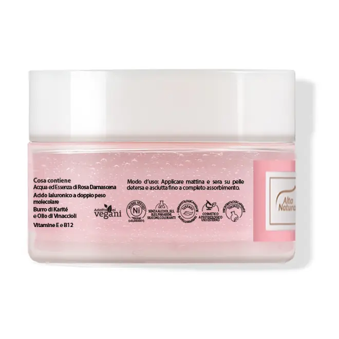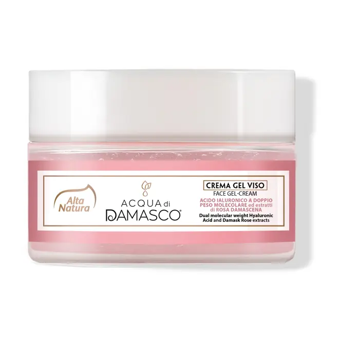 DESCRIZIONELa Crema Gel Viso Acqua di Damasco Alta Natura è una crema-gel ultra leggera, dal finish glow, che rinfresca, idrata e illumina senza appesantire. La sua formula, arricchita con acqua di Rosa Damascena, dall'azione rinfrescante e tonificante, dona un'immediata sensazione di freschezza e vitalità, mentre la combinazione di 2 tipologie di Acido Ialuronico, a basso e medio peso molecolare, trattiene l'idratazione ed aiuta a mantenere la pelle elastica e rimpolpata. Completano la formula il burro di Karité e l'olio di Vinaccioli, emollienti nutrienti adatti anche alle pelli delicate, vitamina E e vitamina B12, dalle proprietà antiossidanti e rivitalizzanti. La texture a base d'acqua si assorbe rapidamente, lasciando la pelle setosa e visibilmente più luminosa, uniforme e idratata. Ideale come base trucco o trattamento quotidiano per chi desidera un incarnato più radioso e una pelle morbida al tatto. La profumazione floreale, delicata e naturale, è ispirata all'autenticità della Rosa di Damasco. Conosciuta come la Regina delle Rose, la Rosa Damascena è da secoli considerata una delle varietà più pregiate, utilizzata nei rituali di bellezza di diverse culture e oggi valorizzata in cosmetica per la sua azione multi-livello. Gli estratti di Rosa Damascena sono infatti noti per le loro proprietà lenitive, riequilibranti e antiossidanti, rendendola ideale anche per pelli sensibili, spente o facilmente reattive. La composizione naturale include flavonoidi, composti aromatici e acidi organici, che contribuiscono a migliorare visibilmente l'aspetto della pelle, favorendone la luminosità, l'uniformità del tono e la sensazione di freschezza. Senza alcool, SLS, SLES, parabeni, siliconi, coloranti. Nickel tested (inferiore a 0,000001). Cosmetico a pH fisiologico; dermatologicamente testato su pelli sensibili. Non testato sugli animali, senza ingredienti di origine animale: cosmetico Vegan. MODALITÀ D'USOApplicare mattina e sera su pelle detersa e asciutta fino a completo assorbimentoSPEDIZIONE La spedizione dei prodotti avviene entro 24 ore dall'ordine (sabato e festivi esclusi), tramite corriere SDA. Quando l'ordine sarà spedito, riceverai una e-mail di conferma, contenente un link alla tracciatura online dell'invio, che ti permetterà di verificare in tempo reale lo stato della spedizione. La consegna avviene normalmente in 2-3 giorni lavorativi. Per gli ordini di importo pari o superiore a 49 € la spedizione in Italia è GRATUITA (escluso eventuale contrassegno), altrimenti ha un costo di 3.95 €. Se sceglierai il pagamento in contrassegno, vi sarà un costo aggiuntivo di 3 €. È possibile richiedere la consegna in fermo deposito presso una filiale SDA o un punto di ritiro Kipoint, indicando nell'indirizzo di consegna "Fermo Deposito SDA", o "Fermo Deposito Kipoint" e l'indirizzo della filiale o del Kipoint scelto. Effettuiamo spedizioni in tutto il mondo: le spese di spedizione per l'estero sono calcolate in base al peso dei prodotti ordinati e mostrate prima dell'invio dell'ordine. In caso di assenza, o di indirizzo incompleto o errato, l'ordine andrà in giacenza presso la sede del corriere, e sarà possibile richiedere un secondo tentativo di consegna o ritirarla di persona entro 7 giorni. È possibile effettuare un ordine sul sito e recarsi a ritirarlo direttamente nel punto vendita di Via Iglesias 5/B a Cagliari. Per scegliere questa possibilità, seleziona l'opzione "Ritiro in negozio" al momento della scelta della modalità di spedizione, in questo modo non ti verranno addebitate le spese di spedizione e sarai avvisato con una e-mail quando l'ordine sarà pronto per il ritiro. La spedizione è accompagnata da un riepilogo d'ordine, oppure dalla fattura se richiesta al momento dell'ordine (selezionando l'apposita casella del modulo d'ordine e specificando l'indirizzo di fatturazione). Dalla tua Area Cliente potrai verificare lo stato di lavorazione dell'ordine e lo stato della spedizione. Per qualsiasi informazione, contattaci via e-mail. Per maggiori dettagli, vedi le Condizioni di vendita. PAGAMENTO Il pagamento degli ordini può avvenire: