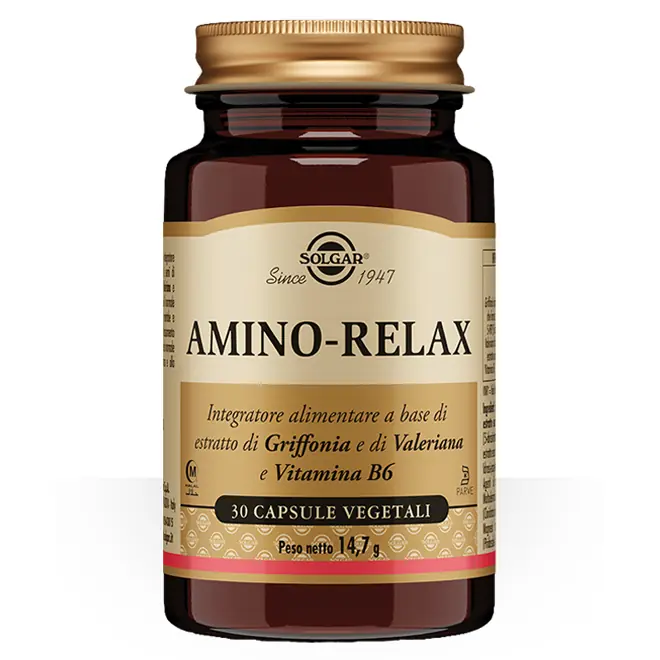 DESCRIZIONEAmino-Relax Solgar è un integratore alimentare contenente una miscela costituita da estratto standardizzato di semi di Griffonia, estratto secco di radice di Valeriana, Magnesio e vitamina B6, formulato per sostenere buon umore e rilassamento mentale. Sentimenti ed emozioni influenzano i meccanismi organici stimolando lo sviluppo di una problematica di salute o, al contrario, contrastandola e favorendo i processi di guarigione. Anche gli alimenti, modificando la biochimica cerebrale, possono influire sull'umore e quindi sulla nostra percezione di benessere, basti pensare agli effetti della tanto amata cioccolata sulla liberazione di serotonina. I semi di Griffonia forniscono il 5-idrossitriptofano (5-HTP), noto come precursore della serotonina. La serotonina è un neurotrasmettitore sintetizzato nel sistema nervoso centrale e nelle cellule dell'apparato gastrointestinale ed è principalmente coinvolto nella regolarizzazione del tono dell'umore. L'estratto di semi di Griffonia contribuisce a mantenere un normale tono dell'umore, il rilassamento, il benessere mentale e aiuta a controllare il senso di fame. L'estratto di Valeriana favorisce il rilassamento in caso di stress e favorisce il sonno. La vitamina B6 e il magnesio riducono la stanchezza e l'affaticamento e favoriscono il normale funzionamento del sistema nervoso e la normale funzione psicologica. La dose giornaliera suggerita di 1 capsula vegetale apporta 334 mg di estratto standardizzato di semi di Griffonia, che formisce 100 mg di 5-HTP (5-idrossitriptofano); 100 mg di estratto secco (4:1) di radice di Valeriana: 10 mg di vitamina B6, 56,3 mg di Magnesio. Integratore senza ingredienti di derivazione animale, adatto a vegetariani e vegani. Senza lattosio. Senza glutine. Certificato HALAL. MODALITÀ D'USOSi consiglia l’utilizzo di 1 capsula vegetale al giorno, da deglutire con acqua, la sera mezzora prima di coricarsi.AVVERTENZEIn caso di sensibilità di stomaco, utilizzare insieme ad uno snack. Non superare la dose giornaliera raccomandata.SPEDIZIONE La spedizione dei prodotti avviene entro 24 ore dall'ordine (sabato e festivi esclusi), tramite corriere SDA. Quando l'ordine sarà spedito, riceverai una e-mail di conferma, contenente un link alla tracciatura online dell'invio, che ti permetterà di verificare in tempo reale lo stato della spedizione. La consegna avviene normalmente in 2-3 giorni lavorativi. Per gli ordini di importo pari o superiore a 49 € la spedizione in Italia è GRATUITA (escluso eventuale contrassegno), altrimenti ha un costo di 3.95 €. Se sceglierai il pagamento in contrassegno, vi sarà un costo aggiuntivo di 3 €. È possibile richiedere la consegna in fermo deposito presso una filiale SDA o un punto di ritiro Kipoint, indicando nell'indirizzo di consegna "Fermo Deposito SDA", o "Fermo Deposito Kipoint" e l'indirizzo della filiale o del Kipoint scelto. Effettuiamo spedizioni in tutto il mondo: le spese di spedizione per l'estero sono calcolate in base al peso dei prodotti ordinati e mostrate prima dell'invio dell'ordine. In caso di assenza, o di indirizzo incompleto o errato, l'ordine andrà in giacenza presso la sede del corriere, e sarà possibile richiedere un secondo tentativo di consegna o ritirarla di persona entro 7 giorni. È possibile effettuare un ordine sul sito e recarsi a ritirarlo direttamente nel punto vendita di Via Iglesias 5/B a Cagliari. Per scegliere questa possibilità, seleziona l'opzione "Ritiro in negozio" al momento della scelta della modalità di spedizione, in questo modo non ti verranno addebitate le spese di spedizione e sarai avvisato con una e-mail quando l'ordine sarà pronto per il ritiro. La spedizione è accompagnata da un riepilogo d'ordine, oppure dalla fattura se richiesta al momento dell'ordine (selezionando l'apposita casella del modulo d'ordine e specificando l'indirizzo di fatturazione). Dalla tua Area Cliente potrai verificare lo stato di lavorazione dell'ordine e lo stato della spedizione. Per qualsiasi informazione, contattaci via e-mail. Per maggiori dettagli, vedi le Condizioni di vendita. PAGAMENTO Il pagamento degli ordini può avvenire: