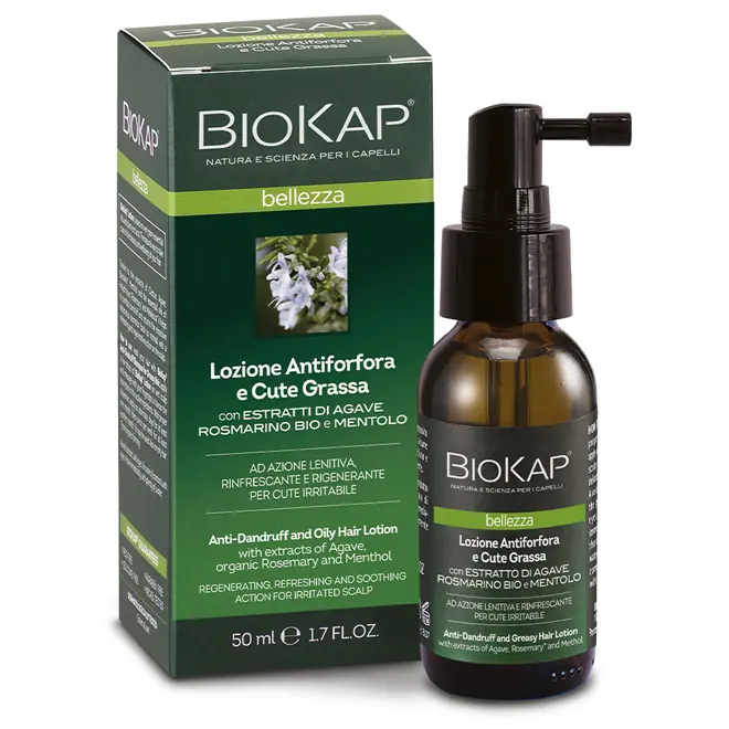 DESCRIZIONEBioKap Lozione Antiforfora e Cute Grassa è un trattamento d'urto in caso di forfora e cute grassa del cuoio capelluto, da associare all'uso dello shampoo specifico, antiforfora o per capelli grassi a seconda della necessità. BioKap Lozione Antiforfora e Cute Grassa, grazie agli estratti di Cactus, Agave, Bardana bio, all'olio essenziale di Menta e al Mentolo, agli oli essenziali di Rosmarino biologico e Timo, aiuta a combattere la forfora e normalizzare l'eccessiva secrezione sebacea, con un'azione lenitiva, rinfrescante e rigenerante del cuoio capelluto, anche irritato. L'azione seboequilibrante aiuta anche a irrobustire e rafforzare il capello, spesso rovinato da un eccesso di sebo. Ottimo da utilizzare anche nei cambi di stagione per un effetto depurativo sul cuoio capelluto. Con il 98% di ingredienti di origine naturale. Senza parabeni, PEG, SLES, siliconi. Nickel tested. Dermatologicamente testato. Non testato sugli animali. Cruelty Free. MODALITÀ D'USOLavare i capelli con BioKap Shampoo Antiforfora o Capelli Grassi, applicare con apposito dosatore alcune gocce di BioKap Lozione sul cuoio capelluto bagnato e massaggiare con i polpastrelli per favorire l’assorbimento degli attivi. Applicare a giorni alterni per almeno un mese, successivamente 2 volte la settimana per ancora un altro mese. Può essere usato anche sui capelli asciutti.SPEDIZIONE La spedizione dei prodotti avviene entro 24 ore dall'ordine (sabato e festivi esclusi), tramite corriere SDA. Quando l'ordine sarà spedito, riceverai una e-mail di conferma, contenente un link alla tracciatura online dell'invio, che ti permetterà di verificare in tempo reale lo stato della spedizione. La consegna avviene normalmente in 2-3 giorni lavorativi. Per gli ordini di importo pari o superiore a 49 € la spedizione in Italia è GRATUITA (escluso eventuale contrassegno), altrimenti ha un costo di 3.95 €. Se sceglierai il pagamento in contrassegno, vi sarà un costo aggiuntivo di 3 €. È possibile richiedere la consegna in fermo deposito presso una filiale SDA o un punto di ritiro Kipoint, indicando nell'indirizzo di consegna "Fermo Deposito SDA", o "Fermo Deposito Kipoint" e l'indirizzo della filiale o del Kipoint scelto. Effettuiamo spedizioni in tutto il mondo: le spese di spedizione per l'estero sono calcolate in base al peso dei prodotti ordinati e mostrate prima dell'invio dell'ordine. In caso di assenza, o di indirizzo incompleto o errato, l'ordine andrà in giacenza presso la sede del corriere, e sarà possibile richiedere un secondo tentativo di consegna o ritirarla di persona entro 7 giorni. È possibile effettuare un ordine sul sito e recarsi a ritirarlo direttamente nel punto vendita di Via Iglesias 5/B a Cagliari. Per scegliere questa possibilità, seleziona l'opzione "Ritiro in negozio" al momento della scelta della modalità di spedizione, in questo modo non ti verranno addebitate le spese di spedizione e sarai avvisato con una e-mail quando l'ordine sarà pronto per il ritiro. La spedizione è accompagnata da un riepilogo d'ordine, oppure dalla fattura se richiesta al momento dell'ordine (selezionando l'apposita casella del modulo d'ordine e specificando l'indirizzo di fatturazione). Dalla tua Area Cliente potrai verificare lo stato di lavorazione dell'ordine e lo stato della spedizione. Per qualsiasi informazione, contattaci via e-mail. Per maggiori dettagli, vedi le Condizioni di vendita. PAGAMENTO Il pagamento degli ordini può avvenire: