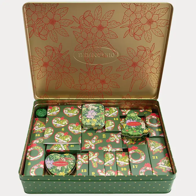 DESCRIZIONEVivi una magica attesa del Natale insieme al Calendario dell'Avvento 2025 L'Erbolario! 24 sorprese di bellezza ti aspettano all'interno della bellissima scatola in latta decorata: ogni giorno apri una delle scatoline e scopri un cosmetico selezionato tra i nostri prodotti bestseller e le ultime novità. I migliori trattamenti L'Erbolario ti aspettano in pratici formati per prendersi cura di viso, corpo e capelli. Puoi riutilizzare ogni scatolina di carta per creare deliziose decorazioni per il tuo albero di Natale e non solo! Come? Passando il cordino nei fori presenti su ciascuna scatolina. Tre sorprese sono custodite in originali box in latta, da conservare insieme alla scatola grande per custodire bijoux o piccoli oggetti. Il Calendario dell'Avvento contiene: - Bella di Notte Profumo 5 ml - Fiordaliso Bagnogel 50 ml - Gin Botanicals Crema Profumata per il Corpo 30 ml - CollagenAttivo Crema Viso Giorno Rimpolpante Effetto Lifiting 5 ml - L'Erbolario Uomo Shampoo Doccia 20 ml - Papavero Soave Sacchetto Profumato per Cassetti - formato vendita - Frangipani Crema Corpo Magica Luce 30 ml - Il Profumo per Lui 5 ml - Mossi & Ricci Shampoo Anti-crespo Lucidante 50 ml - Crema per le Mani con Limone 20 ml - Fiordaliso Sapone Profumato 25 g - Acido Ialuronico Crema Corpo Idratazione Intensa a Tripla Azione 30 ml - Gin Botanicals Profumo 5 ml - Bella di Notte Bagnoschiuma 50 ml - Acido Ialuronico per Lui Crema Viso 24 h Ai 3 Acidi Ialuronici Idratante Opacizzante 10 ml - Fico Crema Profumata per il Corpo 20 ml - Tè Nero Crema Corpo & Mani 30 ml - Gin Botanicals Sapone Profumato 30 g - Fior di Salina Bagnoschiuma 20 ml - CollagenAttivo Crema Viso Notte Rimpolpante Rassodante 5 ml - 3 Rosa Crema Corpo 30 ml - Iris Bianco BagnoCrema 50 ml - Cocco Shampoo Solido 15 g - Bella di Notte Crema Profumata per il Corpo 20 ml Tutti i cosmetici contenuti nella confezione sono senza parabeni, siliconi, petrolati. Testati su 8 metalli (nichel, piombo, arsenico, cadmio, mercurio, antimonio, cromo, cobalto) per minimizzare i rischi di allergia e salvaguardare anche le pelli più sensibili. Nickel tested, senza OGM, dermatologicamente testati. Senza ingredienti di derivazione animale. Non testati sugli animali. La confezione esterna è in carta FSC, biodegradabile, compostabile e riciclabile, ottenuta secondo i rigorosi standard ambientali e sociali del Forest Stewardship Council a supporto di una corretta e responsabile gestione delle risorse forestali. Per un corretto smaltimento dei componenti di imballo, tutte le informazioni necessarie sono riportate nella tabella relativa alla raccolta differenziata, presente sull'astuccio o sulla confezione primaria. Il Calendario dell'Avvento chiuso misura 25,8 cm x 35 cm x 7,2 cm 100% Made in Italy. MODALITÀ D'USOSeguire le indicazioni presenti nelle singole confezioni, per ogni prodotto cosmetico presente nel Calendario.RECENSIONI
