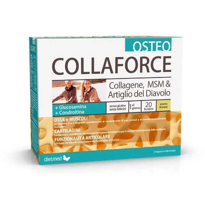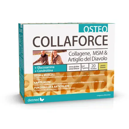 DESCRIZIONECollaforce Osteo è un integratore a base di Collagene idrolizzato enzimaticamente, Acido Ialuronico, Artiglio del Diavolo, vitamina D, vitamina C, Calcio, Magnesio, MSM, glucosamina e condroitina, formulazione utile per sostenere la funzionalità di ossa e muscoli, cartilagini, articolazioni. Proprietà e IndicazioniLa Vitamina D e il Magnesio contribuiscono al mantenimiento di ossa normali e al normale funzionamento muscolare. La Vitamina C contribuisce alla normale formazione del collagene per il normale funzionamento delle cartilagini. L'Artiglio del diavolo contribuisce alla funzionalità articolare. Il Collagene è la principale proteina strutturale del tessuto connettivo nel corpo, si trova nella pelle, cartilagini, ossa, denti, membrane e cornee ed è responsabile delle proprietà meccaniche della pelle. L'Acido Ialuronico è una sostanza idrofila in grado di legare un gran numero di molecole d'acqua; a livello dermico contribuisce quindi al mantenimento del contenuto idrico della pelle, mentre a livello articolare un adeguato contenuto di acido ialuronico nel liquido sinoviale presenta azione lubrificante e consente all'organismo di ammortizzare gli shock meccanici. Glucosamina e Condroitina, sono componenti strutturali della cartilagine, a cui donano resistenza ed elasticità oltre a permettere di trattenere acqua e quindi migliorare la lubrificazione articolare. Contiene inoltre MSM (metil-sulfonil-metano), un composto organico dello Zolfo ad elevata qualità e biodisponibilità, facilmente assimilabile nell'organismo umano: l'organismo richiede un costante apporto di Zolfo per il turnover cellulare e il corretto funzionamento delle stesse cellule: lo Zolfo è infatti costituente di composti attivi nei tessuti, nelle cartilagini e nei tendini. Principi attiviLa dose giornaliera di 1 bustina apporta: Collagene Idrolizzato Enzimaticamente 8000 mg, Solfato di Glucosamina 210 mg, Solfato di Condroitina 160 mg, MSM 50 mg, Estratto di Artiglio del diavolo 50 mg, Calcio 160 mg (20% VNR - Valore Nutritivo di Riferimento), Magnesio 75 mg (20% VNR), Vitamina C 80 mg (100% VNR), Acido Ialuronico 10 mg, Vitamina D 5 µg (100% VNR). Caratteristiche distintiveGradevolmente aromatizzato al Limone. Non contiene conservanti; senza lattosio e latticini, glutine, latticini, soia, lievito. Non testato su animali. MODALITÀ D'USOSi suggerisce l'assunzione di 1 bustina al giorno, preferibilmente dopo colazione. Può essere dissolta in un bicchiere dacqua o succo di frutta.AVVERTENZESi suggerisce di consultare un medico in caso di gravidanza e allattamento.RECENSIONI