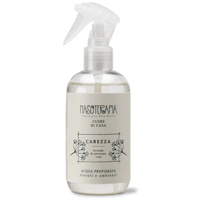 DESCRIZIONEL'Acqua Profumata Carezza è pensata per avvolgere a lungo i tessuti o per essere nebulizzata nell'aria in maniera istantanea e persistente. Regala nuova freschezza a tutti i tessili della casa e agli indumenti riposti in armadio. Una fragranza ricca e sfaccettata racchiusa in un'acqua profumata ideale per rinfrescare tende, tappeti, divani, cuscini, interni di armadi e cassetti lasciando un piacevole profumo di pulito. Negli ambienti rinnova l'aria con una delicata e prolungata fragranza, in cui le note aromatiche della Lavanda incontrano i tocchi floreali dell'Iris in modo sorprendente, creando un accordo olfattivo avvolgente. Note vivaci e agrumate fanno da cornice ai protagonisti sentori di Lavanda, che si fondono negli accordi fioriti e nei puliti accenni di Muschio Bianco, Muschio di Quercia e Iris. Caratteristiche distintiveFormulata su base acquosa non macchia, non lascia aloni o residui sui tessuti. 100% Made in Italy e a norma IFRA. MODALITÀ D'USOSpruzzare a circa 30 cm di distanza.Può essere spruzzata anche negli ambienti o su tutti gli altri tessili di casa, anche durante la stiratura o prima di riporre i capi in cassetti ed armadi. AVVERTENZESi consiglia di evitare l’esposizione diretta del prodotto alla luce. Eventuali modifiche nella colorazione o sedimenti non ne compromettono la qualità.I simboli di pericolo riportati sulle etichette dei prodotti derivano dalla presenza di oli essenziali puri e naturali. SPEDIZIONE La spedizione dei prodotti avviene entro 24 ore dall'ordine (sabato e festivi esclusi), tramite corriere SDA. Quando l'ordine sarà spedito, riceverai una e-mail di conferma, contenente un link alla tracciatura online dell'invio, che ti permetterà di verificare in tempo reale lo stato della spedizione. La consegna avviene normalmente in 2-3 giorni lavorativi. Per gli ordini di importo pari o superiore a 49 € la spedizione in Italia è GRATUITA (escluso eventuale contrassegno), altrimenti ha un costo di 3.95 €. Se sceglierai il pagamento in contrassegno, vi sarà un costo aggiuntivo di 3 €. È possibile richiedere la consegna in fermo deposito presso una filiale SDA o un punto di ritiro Kipoint, indicando nell'indirizzo di consegna "Fermo Deposito SDA", o "Fermo Deposito Kipoint" e l'indirizzo della filiale o del Kipoint scelto. Effettuiamo spedizioni in tutto il mondo: le spese di spedizione per l'estero sono calcolate in base al peso dei prodotti ordinati e mostrate prima dell'invio dell'ordine. In caso di assenza, o di indirizzo incompleto o errato, l'ordine andrà in giacenza presso la sede del corriere, e sarà possibile richiedere un secondo tentativo di consegna o ritirarla di persona entro 7 giorni. È possibile effettuare un ordine sul sito e recarsi a ritirarlo direttamente nel punto vendita di Via Iglesias 5/B a Cagliari. Per scegliere questa possibilità, seleziona l'opzione "Ritiro in negozio" al momento della scelta della modalità di spedizione, in questo modo non ti verranno addebitate le spese di spedizione e sarai avvisato con una e-mail quando l'ordine sarà pronto per il ritiro. La spedizione è accompagnata da un riepilogo d'ordine, oppure dalla fattura se richiesta al momento dell'ordine (selezionando l'apposita casella del modulo d'ordine e specificando l'indirizzo di fatturazione). Dalla tua Area Cliente potrai verificare lo stato di lavorazione dell'ordine e lo stato della spedizione. Per qualsiasi informazione, contattaci via e-mail. Per maggiori dettagli, vedi le Condizioni di vendita. PAGAMENTO Il pagamento degli ordini può avvenire: