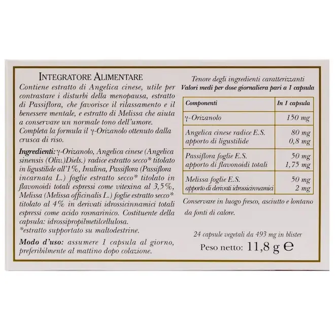 DESCRIZIONEErbadonna 1 è un integratore alimentare utile per contrastare i disturbi della menopausa, formulato con Angelica cinese, una pianta da sempre usata in Oriente dalla medicina tradizionale per i "problemi femminili", associata a Passiflora e Melissa, che favoriscono il rilassamento e il benessere mentale e il mantenimento di un normale tono dell'umore. Completa la formula l'aggiunta di gamma-orizanolo estratto dalla crusca di Riso. Proprietà e IndicazioniSono molteplici i segnali che consentono ad ogni donna di riconoscere l'avvicinarsi della menopausa, un periodo particolarmente delicato della propria vita: tra i sintomi che la preannunciano, i più evidenti sono le improvvise vampate di calore, uno stato diffuso di irritabilità, il sonno della notte disturbato da intense sudorazioni. La Natura viene in aiuto all'organismo, con soluzioni in grado di alleviare e tenere sotto controllo questi disagi. Erbadonna 1 è un naturale ed efficace alleato delle donne in questo particolare momento legato alla loro femminilità. Una capsula al giorno si rivela preziosa soprattutto per contribuire ad alleviare i fastidi legati al primo periodo della menopausa. Principi attiviOgni capsula vegetale contiene 80 mg di estratto secco di radice di Angelica cinese titolato all'1% in ligustilide (0,8 mg di ligustilide); 50 mg di estratto secco di Passiflora titolato al 3,5% in flavonoidi totali espressi come vitexina (50 mg di flavonoidi); 50 mg di estratto secco di Melissa titolato al 4% in derivati idrossicinnamici espressi come acido rosmarinico (2 mg di derivati di idrossicinnamici); 150 mg di gamma-orizanolo estratto dalla crusca di Riso. Caratteristiche distintiveIntegratore senza glutine, senza lattosio. Senza OGM. Senza ingredienti di origine animale: adatto a vegetariani e vegani. MODALITÀ D'USOSi consiglia di assumere 1 capsula al giorno preferibilmente al mattino dopo colazione.SPEDIZIONE La spedizione dei prodotti avviene entro 24 ore dall'ordine (sabato e festivi esclusi), tramite corriere SDA. Quando l'ordine sarà spedito, riceverai una e-mail di conferma, contenente un link alla tracciatura online dell'invio, che ti permetterà di verificare in tempo reale lo stato della spedizione. La consegna avviene normalmente in 2-3 giorni lavorativi. Per gli ordini di importo pari o superiore a 49 € la spedizione in Italia è GRATUITA (escluso eventuale contrassegno), altrimenti ha un costo di 3.95 €. Se sceglierai il pagamento in contrassegno, vi sarà un costo aggiuntivo di 3 €. È possibile richiedere la consegna in fermo deposito presso una filiale SDA o un punto di ritiro Kipoint, indicando nell'indirizzo di consegna "Fermo Deposito SDA", o "Fermo Deposito Kipoint" e l'indirizzo della filiale o del Kipoint scelto. Effettuiamo spedizioni in tutto il mondo: le spese di spedizione per l'estero sono calcolate in base al peso dei prodotti ordinati e mostrate prima dell'invio dell'ordine. In caso di assenza, o di indirizzo incompleto o errato, l'ordine andrà in giacenza presso la sede del corriere, e sarà possibile richiedere un secondo tentativo di consegna o ritirarla di persona entro 7 giorni. È possibile effettuare un ordine sul sito e recarsi a ritirarlo direttamente nel punto vendita di Via Iglesias 5/B a Cagliari. Per scegliere questa possibilità, seleziona l'opzione "Ritiro in negozio" al momento della scelta della modalità di spedizione, in questo modo non ti verranno addebitate le spese di spedizione e sarai avvisato con una e-mail quando l'ordine sarà pronto per il ritiro. La spedizione è accompagnata da un riepilogo d'ordine, oppure dalla fattura se richiesta al momento dell'ordine (selezionando l'apposita casella del modulo d'ordine e specificando l'indirizzo di fatturazione). Dalla tua Area Cliente potrai verificare lo stato di lavorazione dell'ordine e lo stato della spedizione. Per qualsiasi informazione, contattaci via e-mail. Per maggiori dettagli, vedi le Condizioni di vendita. PAGAMENTO Il pagamento degli ordini può avvenire: