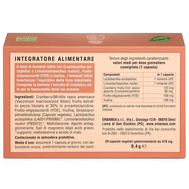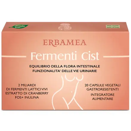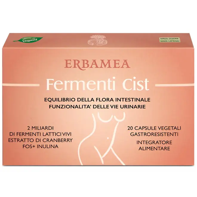 DESCRIZIONEFermenti Cist Erbamea è un integratore alimentare per l'equilibrio della flora intestinale e la funzionalità delle vie urinarie. Proprietà e Indicazioni - Fermenti CistContiene 2 miliardi di fermenti lattici vivi (Lactobacillus acidophilus e Limosilactobacillus reuteri), Frutto-oligosaccaridi (FOS) e Inulina. I fermenti lattici favoriscono l'equilibrio della flora intestinale. Completa la formula l'estratto di Cranberry utile per la funzionalità delle vie urinarie. Contiene inoltre frutto-oligosaccaridi (FOS) e inulina, utili come prebiotici per favorire la flora batterica "buona" che colonizza l'intestino. Ingredienti funzionaliOgni capsula vegetale apporta 1 miliardo UFC (contenuto in cellule vive espresse in Unità Formanti Colonia) di Lactobacillus acidophilus (LA001/PBS066), 1 miliardo UFC di Limosilactobacillus reuteri (PBS072); 120 mg di estratto secco di frutti di Cranberry titolato al 30% in proantocianidine (36 mg di proantocianidine); 100 mg di Frutto-oligosaccaridi; 100 mg di Inulina. Caratteristiche distintiveLe capsule gastroresistenti, che permettono ai fermenti lattici vivi di arrivare vitali all'intestino superando la barriera gastrica, sono di origine vegetale, di cellulosa ottenuta da alberi provenienti da coltivazioni controllate e gestite in maniera sostenibile. Senza ingredienti di derivazione animale, adatto a vegetariani e vegani. Senza glutine. Senza lattosio. MODALITÀ D'USOAssumere 1 capsula al giorno, preferibilmente lontano dai pasti.Il periodo ideale di assunzione è almeno 3-4 settimane, arco di tempo necessario perchè i batteri "buoni" riescano ad insediarsi nell'intestino apportando i benefici necessari. Assumere i fermenti lattici per pochi giorni non fornisce un quantitativo tale di batteri da consentire il miglioramento del microbiota intestinale. SPEDIZIONE La spedizione dei prodotti avviene entro 24 ore dall'ordine (sabato e festivi esclusi), tramite corriere SDA. Quando l'ordine sarà spedito, riceverai una e-mail di conferma, contenente un link alla tracciatura online dell'invio, che ti permetterà di verificare in tempo reale lo stato della spedizione. La consegna avviene normalmente in 2-3 giorni lavorativi. Per gli ordini di importo pari o superiore a 49 € la spedizione in Italia è GRATUITA (escluso eventuale contrassegno), altrimenti ha un costo di 3.95 €. Se sceglierai il pagamento in contrassegno, vi sarà un costo aggiuntivo di 3 €. È possibile richiedere la consegna in fermo deposito presso una filiale SDA o un punto di ritiro Kipoint, indicando nell'indirizzo di consegna "Fermo Deposito SDA", o "Fermo Deposito Kipoint" e l'indirizzo della filiale o del Kipoint scelto. Effettuiamo spedizioni in tutto il mondo: le spese di spedizione per l'estero sono calcolate in base al peso dei prodotti ordinati e mostrate prima dell'invio dell'ordine. In caso di assenza, o di indirizzo incompleto o errato, l'ordine andrà in giacenza presso la sede del corriere, e sarà possibile richiedere un secondo tentativo di consegna o ritirarla di persona entro 7 giorni. È possibile effettuare un ordine sul sito e recarsi a ritirarlo direttamente nel punto vendita di Via Iglesias 5/B a Cagliari. Per scegliere questa possibilità, seleziona l'opzione "Ritiro in negozio" al momento della scelta della modalità di spedizione, in questo modo non ti verranno addebitate le spese di spedizione e sarai avvisato con una e-mail quando l'ordine sarà pronto per il ritiro. La spedizione è accompagnata da un riepilogo d'ordine, oppure dalla fattura se richiesta al momento dell'ordine (selezionando l'apposita casella del modulo d'ordine e specificando l'indirizzo di fatturazione). Dalla tua Area Cliente potrai verificare lo stato di lavorazione dell'ordine e lo stato della spedizione. Per qualsiasi informazione, contattaci via e-mail. Per maggiori dettagli, vedi le Condizioni di vendita. PAGAMENTO Il pagamento degli ordini può avvenire: