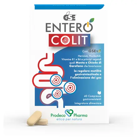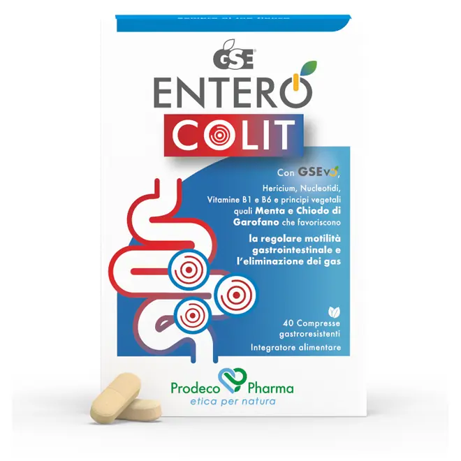 DESCRIZIONEGSE Entero Colit è un integratore alimentare a base di estratto di semi di Pompelmo (GSEvo), Hericium, Perilla, Chiodi di Garofano, Menta, Nucleotidi, vitamina B1 e B6. Proprietà e IndicazioniI componenti di GSEvo, composto da estratto secco e liofilizzato di semi di Pompelmo, svolgono un'azione antiossidante e contribuiscono all'equilibrio microbico dell'organismo. La Perilla promuove le naturali difese dell'organismo. Gli oli essenziali di Menta e Chiodo di Garofano favoriscono la funzionalità digestiva, la regolare motilità gastrointestinale e l'eliminazione dei gas. Le vitamine B1 e B6 contribuiscono al normale metabolismo energetico e alla normale funzione psicologica. La vitamina B6 inoltre favorisce la normale funzione del sistema immunitario e contribuisce a ridurre la stanchezza e l'affaticamento. L'Hericium è considerato tradizionalmente il fungo dell'apparato digerente. Nella medicina tradizionale cinese, l'Hericium viene utilizzato per disturbi di stomaco e problemi gastrointestinali e per la protezione contro le lesioni della mucosa gastrointestinale. Principi attiviLa dose massima giornaliera consigliata di 2 compresse apporta 300 mg di estratto secco di foglie di Perilla, di cui 30 mg di polifenoli; 250 mg di GSEvo, di cui 200 mg di estratto secco e 50 mg di estratto liofilizzato di semi di Pompelmo; 250 mg di estratto secco di corpo fruttifero di Hericium, di cui 75 mg di polisaccaridi; 30 mg di olio essenziale di chiodi di Garofano in polvere di cui 9 mg di beta-cariofillene; 30 mg di olio essenziale di Menta di cui 10,5 mg di Mentolo; 30 mg di nucleotidi; 4 mg di vitamina B6; 2 mg di vitamina B1. Caratteristiche distintiveSenza glutine. Non contiene fonti di lattosio. Certificato Vegan OK: senza ingredienti di derivazione animale, adatto ai vegetariani e ai vegani. Con astuccio realizzato senza plastificazione e con carta certificata FSC ed ECOLABEL che ne certificano il ridotto impatto ambientale durante l'intero ciclo di vita. MODALITÀ D'USOAssumere 2 compresse al giorno, una a metà mattina e una a metà pomeriggio.AVVERTENZEControindicato in gravidanza e allattamento e sotto gli 8 anni di età.SPEDIZIONE La spedizione dei prodotti avviene entro 24 ore dall'ordine (sabato e festivi esclusi), tramite corriere SDA. Quando l'ordine sarà spedito, riceverai una e-mail di conferma, contenente un link alla tracciatura online dell'invio, che ti permetterà di verificare in tempo reale lo stato della spedizione. La consegna avviene normalmente in 2-3 giorni lavorativi. Per gli ordini di importo pari o superiore a 49 € la spedizione in Italia è GRATUITA (escluso eventuale contrassegno), altrimenti ha un costo di 3.95 €. Se sceglierai il pagamento in contrassegno, vi sarà un costo aggiuntivo di 3 €. È possibile richiedere la consegna in fermo deposito presso una filiale SDA o un punto di ritiro Kipoint, indicando nell'indirizzo di consegna "Fermo Deposito SDA", o "Fermo Deposito Kipoint" e l'indirizzo della filiale o del Kipoint scelto. Effettuiamo spedizioni in tutto il mondo: le spese di spedizione per l'estero sono calcolate in base al peso dei prodotti ordinati e mostrate prima dell'invio dell'ordine. In caso di assenza, o di indirizzo incompleto o errato, l'ordine andrà in giacenza presso la sede del corriere, e sarà possibile richiedere un secondo tentativo di consegna o ritirarla di persona entro 7 giorni. È possibile effettuare un ordine sul sito e recarsi a ritirarlo direttamente nel punto vendita di Via Iglesias 5/B a Cagliari. Per scegliere questa possibilità, seleziona l'opzione "Ritiro in negozio" al momento della scelta della modalità di spedizione, in questo modo non ti verranno addebitate le spese di spedizione e sarai avvisato con una e-mail quando l'ordine sarà pronto per il ritiro. La spedizione è accompagnata da un riepilogo d'ordine, oppure dalla fattura se richiesta al momento dell'ordine (selezionando l'apposita casella del modulo d'ordine e specificando l'indirizzo di fatturazione). Dalla tua Area Cliente potrai verificare lo stato di lavorazione dell'ordine e lo stato della spedizione. Per qualsiasi informazione, contattaci via e-mail. Per maggiori dettagli, vedi le Condizioni di vendita. PAGAMENTO Il pagamento degli ordini può avvenire: