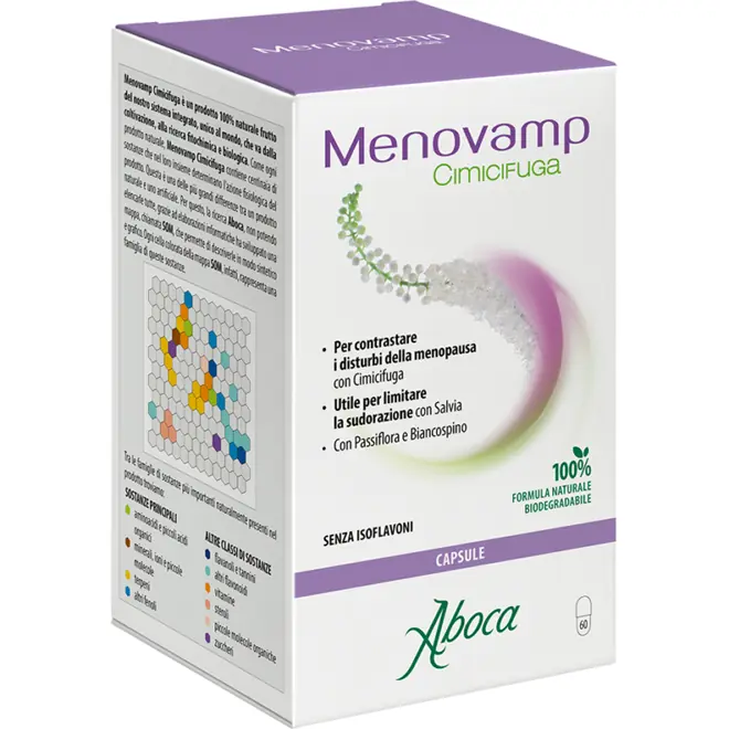 DESCRIZIONEMenovamp Cimicifuga è un prodotto 100% naturale e non contiene sostanze di sintesi, semisintesi o geneticamente modificate. Utile per contrastare i principali disturbi tipici associati alla menopausa come le vampate di calore grazie alla Cimicifuga. Contribuisce a limitare l'eccessiva sudorazione e supporta la remineralizzazione della struttura ossea che può subire modifiche nel periodo della menopausa grazie alla Salvia. La formulazione è completata dalla Passiflora utile per favorire il rilassamento e dal Biancospino utile per supportare l'apparato circolatorio. La dose giornaliera consigliata di 2 capsule apporta 334 mg di Passiflora foglie concentrato totale, titolato in flavonoidi totali espressi come vitexina 7% (23,4 mg); 8,1 mg di Cimicifuga rizoma estratto secco, titolato in glicosidi triterpenici 4% (0,32 mg); 256 mg Biancospino sommità fiorite polvere; 202 mg di Salvia foglie estratto secco, titolato in sostanze fenoliche totali 2,5% (5,0 mg). Formula 100% naturale e biodegradabile, priva di glutine e lattosio. MODALITÀ D'USOSi consiglia l’assunzione di 1 capsula 2 volte al giorno, preferibilmente al mattino e alla sera prima dei pasti. La posologia può essere aumentata a 3 capsule al giorno in caso di necessità.AVVERTENZEPer l’uso e la durata dell’assunzione si consiglia di consultare il medico. Non utilizzare comunque in caso di disfunzioni o malattie epatiche.SPEDIZIONE La spedizione dei prodotti avviene entro 24 ore dall'ordine (sabato e festivi esclusi), tramite corriere SDA. Quando l'ordine sarà spedito, riceverai una e-mail di conferma, contenente un link alla tracciatura online dell'invio, che ti permetterà di verificare in tempo reale lo stato della spedizione. La consegna avviene normalmente in 2-3 giorni lavorativi. Per gli ordini di importo pari o superiore a 49 € la spedizione in Italia è GRATUITA (escluso eventuale contrassegno), altrimenti ha un costo di 3.95 €. Se sceglierai il pagamento in contrassegno, vi sarà un costo aggiuntivo di 3 €. È possibile richiedere la consegna in fermo deposito presso una filiale SDA o un punto di ritiro Kipoint, indicando nell'indirizzo di consegna "Fermo Deposito SDA", o "Fermo Deposito Kipoint" e l'indirizzo della filiale o del Kipoint scelto. Effettuiamo spedizioni in tutto il mondo: le spese di spedizione per l'estero sono calcolate in base al peso dei prodotti ordinati e mostrate prima dell'invio dell'ordine. In caso di assenza, o di indirizzo incompleto o errato, l'ordine andrà in giacenza presso la sede del corriere, e sarà possibile richiedere un secondo tentativo di consegna o ritirarla di persona entro 7 giorni. È possibile effettuare un ordine sul sito e recarsi a ritirarlo direttamente nel punto vendita di Via Iglesias 5/B a Cagliari. Per scegliere questa possibilità, seleziona l'opzione "Ritiro in negozio" al momento della scelta della modalità di spedizione, in questo modo non ti verranno addebitate le spese di spedizione e sarai avvisato con una e-mail quando l'ordine sarà pronto per il ritiro. La spedizione è accompagnata da un riepilogo d'ordine, oppure dalla fattura se richiesta al momento dell'ordine (selezionando l'apposita casella del modulo d'ordine e specificando l'indirizzo di fatturazione). Dalla tua Area Cliente potrai verificare lo stato di lavorazione dell'ordine e lo stato della spedizione. Per qualsiasi informazione, contattaci via e-mail. Per maggiori dettagli, vedi le Condizioni di vendita. PAGAMENTO Il pagamento degli ordini può avvenire: