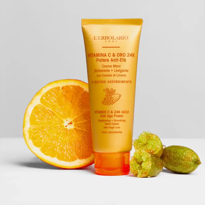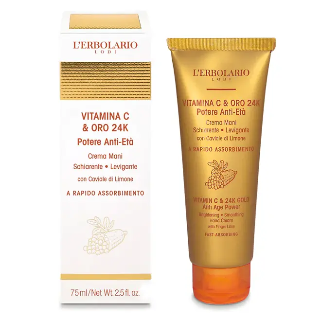 DESCRIZIONELa Crema Mani Schiarente Levigante Vitamina C & Oro 24K L'Erbolario ad azione schiarente e levigante previene e attenua visibilmente macchie e discromie e segni del tempo della pelle, combattendo l'iperpigmentazione. La texture ricca ma leggera di questa Crema Mani si fonde rapidamente sulla pelle, lasciando mani morbide e lisce. Proprietà e IndicazioniLa formula si avvale delle proprietà degli estratti di Melograno e Limone. Vitamina C e Oro 24k, Caviale di Limone ed estratto di Lime offrono un effetto anti-age e levigante. La texture ricca ma leggera di questa Crema Mani si fonde rapidamente sulla pelle, lasciando mani morbide e lisce. La vitamina C, antiossidante per eccellenza, stimola la produzione di Collagene e previene la comparsa di rughe superficiali. Migliora elasticità, tono e luminosità della pelle. Le particelle d'Oro puro svolgono un'azione levigante e tonificante. Veicolano efficacemente a livello cutaneo le molecole di vitamina C e ne potenziano la performance anti age. Puro al 100%, eticamente sostenibile, l'Oro certificato utilizzato in questa formulazione segue lo Standard Fairmined, che garantisce condizioni di massima tutela ai lavoratori e all'ambiente. Caratteristiche distintiveFormula con il 98% di ingredienti di origine naturale; la restante percentuale di ingredienti garantisce stabilità e gradevolezza del prodotto. Prodotto cosmetico senza parabeni, siliconi, tensioattivi solfati e petrolati; testato su 8 metalli (nichel, piombo, arsenico, cadmio, mercurio, antimonio, cromo, cobalto) per minimizzare i rischi di allergia e salvaguardare anche le pelli più sensibili. Nickel tested, senza OGM, dermatologicamente testato. Senza ingredienti di derivazione animale. Non testato sugli animali. Con confezione ecosostenibile, nel pieno rispetto anche dell'ambiente: il tubo è realizzato in Green-PE, materiale derivato al 100% da Canna da zucchero, quindi da una fonte vegetale e rinnovabile; il packaging esterno è in carta FSC, biodegradabile, compostabile e riciclabile, ottenuta secondo i rigorosi standard ambientali e sociali del Forest Stewardship Council (FSC) a supporto di una corretta e responsabile gestione delle risorse forestali. Per un corretto smaltimento dei componenti di imballo, tutte le informazioni necessarie sono riportate nella tabella relativa alla raccolta differenziata, presente sull'astuccio o sulla confezione primaria. 100% Made in Italy. MODALITÀ D'USOApplicare la crema sulla pelle delle mani con un leggero massaggio.SPEDIZIONE La spedizione dei prodotti avviene entro 24 ore dall'ordine (sabato e festivi esclusi), tramite corriere SDA. Quando l'ordine sarà spedito, riceverai una e-mail di conferma, contenente un link alla tracciatura online dell'invio, che ti permetterà di verificare in tempo reale lo stato della spedizione. La consegna avviene normalmente in 2-3 giorni lavorativi. Per gli ordini di importo pari o superiore a 49 € la spedizione in Italia è GRATUITA (escluso eventuale contrassegno), altrimenti ha un costo di 3.95 €. Se sceglierai il pagamento in contrassegno, vi sarà un costo aggiuntivo di 3 €. È possibile richiedere la consegna in fermo deposito presso una filiale SDA o un punto di ritiro Kipoint, indicando nell'indirizzo di consegna "Fermo Deposito SDA", o "Fermo Deposito Kipoint" e l'indirizzo della filiale o del Kipoint scelto. Effettuiamo spedizioni in tutto il mondo: le spese di spedizione per l'estero sono calcolate in base al peso dei prodotti ordinati e mostrate prima dell'invio dell'ordine. In caso di assenza, o di indirizzo incompleto o errato, l'ordine andrà in giacenza presso la sede del corriere, e sarà possibile richiedere un secondo tentativo di consegna o ritirarla di persona entro 7 giorni. È possibile effettuare un ordine sul sito e recarsi a ritirarlo direttamente nel punto vendita di Via Iglesias 5/B a Cagliari. Per scegliere questa possibilità, seleziona l'opzione "Ritiro in negozio" al momento della scelta della modalità di spedizione, in questo modo non ti verranno addebitate le spese di spedizione e sarai avvisato con una e-mail quando l'ordine sarà pronto per il ritiro. La spedizione è accompagnata da un riepilogo d'ordine, oppure dalla fattura se richiesta al momento dell'ordine (selezionando l'apposita casella del modulo d'ordine e specificando l'indirizzo di fatturazione). Dalla tua Area Cliente potrai verificare lo stato di lavorazione dell'ordine e lo stato della spedizione. Per qualsiasi informazione, contattaci via e-mail. Per maggiori dettagli, vedi le Condizioni di vendita. PAGAMENTO Il pagamento degli ordini può avvenire: